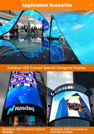 The outdoor flexible LED display module can be used to splice curved screens, cylinders, or any other curved surfaces, etc.