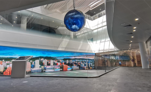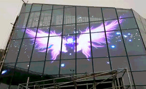 Transparent LED Glass Curtain for Building Glass FacadeTransparent LED screen behind glass wall as media facade, indoor rated but with high transparency rate and brightness.