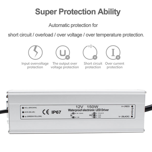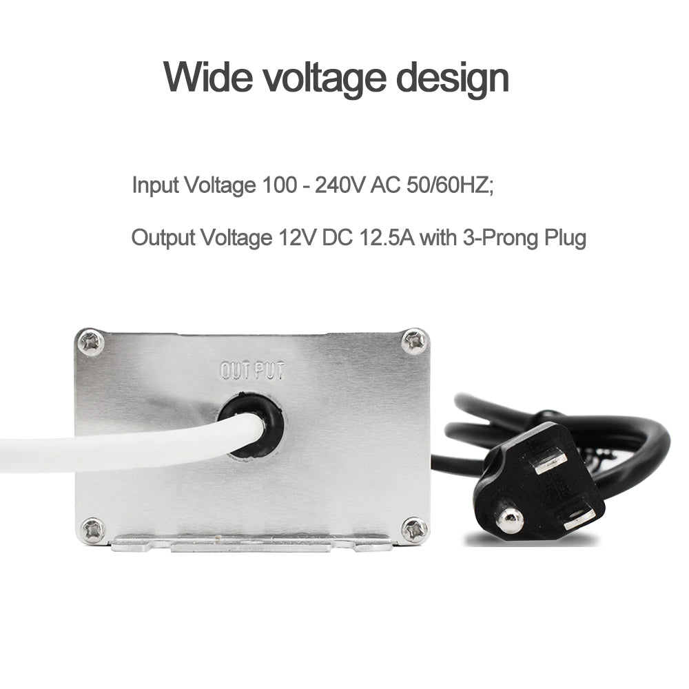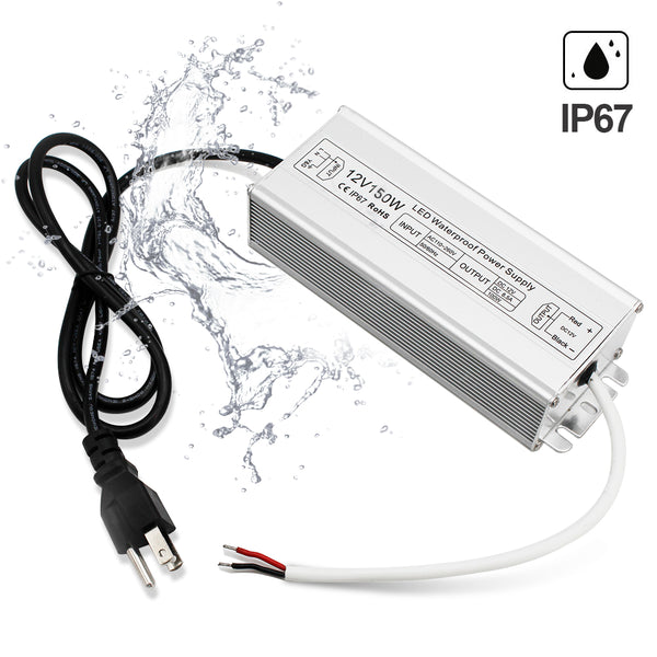 - 150W IP67 waterproof power supply, 3-Prong 3.3FT cable included.